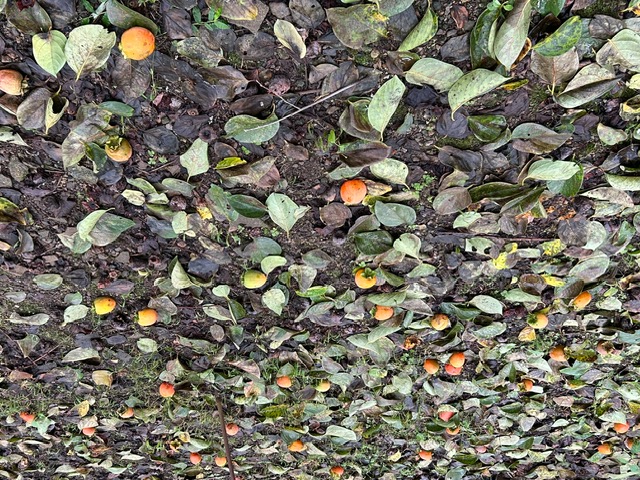 下の写真は、地面に落ちてしまったたくさんの百目柿です。